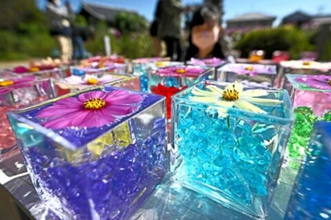 West Japan temple nag display ng mga makukulay na cosmos flower